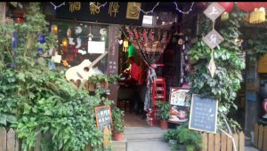 再往前走,拐进一条小巷,巷子里忽然没了油烟气和宣泄声,多了很多无痛纹身,素描,算卦,小饰品的店面。还没走两步,就听到不远处,隔着石台传来悠扬的吉他声以及迷离的温柔的男声女声: